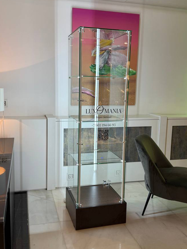 Продолжаем расширять границы привычной полиграфии и выходим в пространство премиального оборудования для ритейла. Мы разработали и изготовили индивидуальную витрину из стекла с подсветкой для демонстрации эксклюзивных товаров — тех, что требуют особого представления и достойного обрамления.